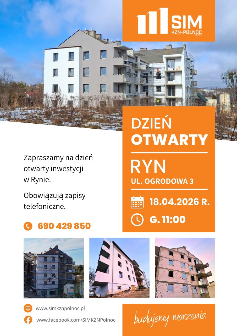 SIM KZN-Północ zaprasza osoby zainteresowane najmem mieszkań na Dzień Otwarty inwestycji w Rynie, który odbędzie się 18 kwietnia 2026 r. o godz. 11:00 przy ul. Ogrodowej 3.