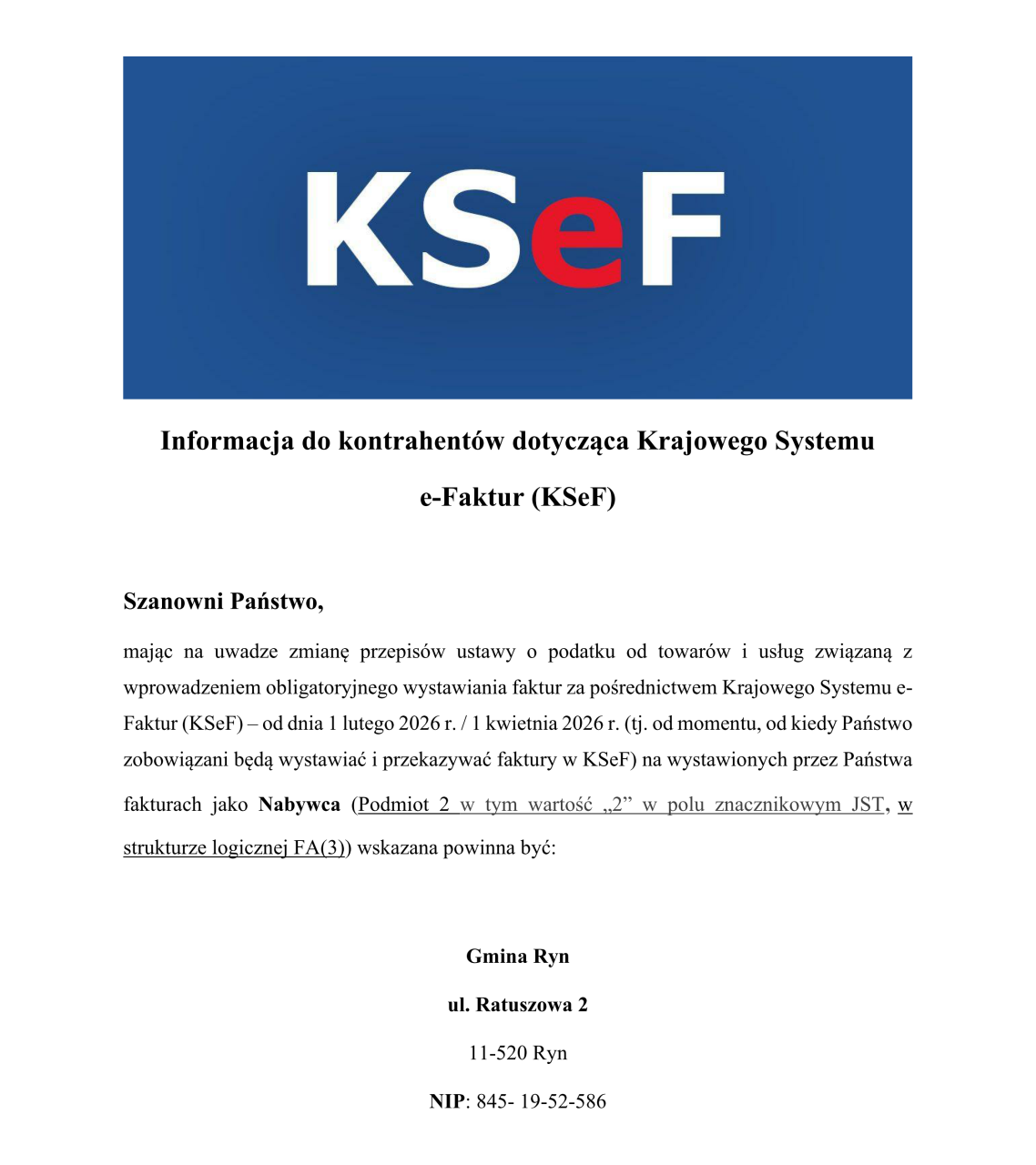 Emilia Kowalewska 19 stycznia, 2026 Informacja dla kontrahentów dotycząca Krajowego Systemu e-Faktur (KSeF)