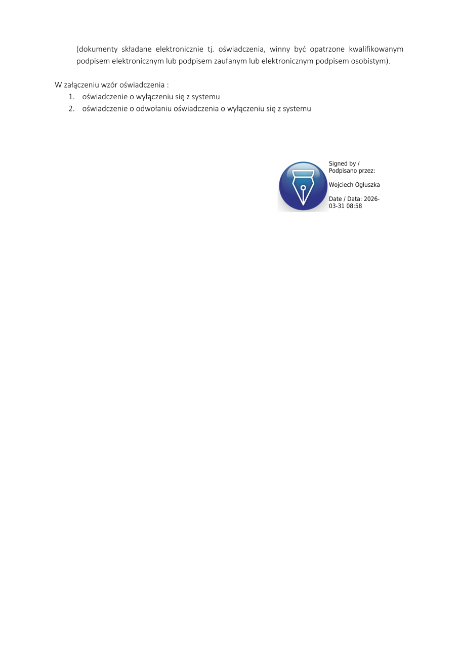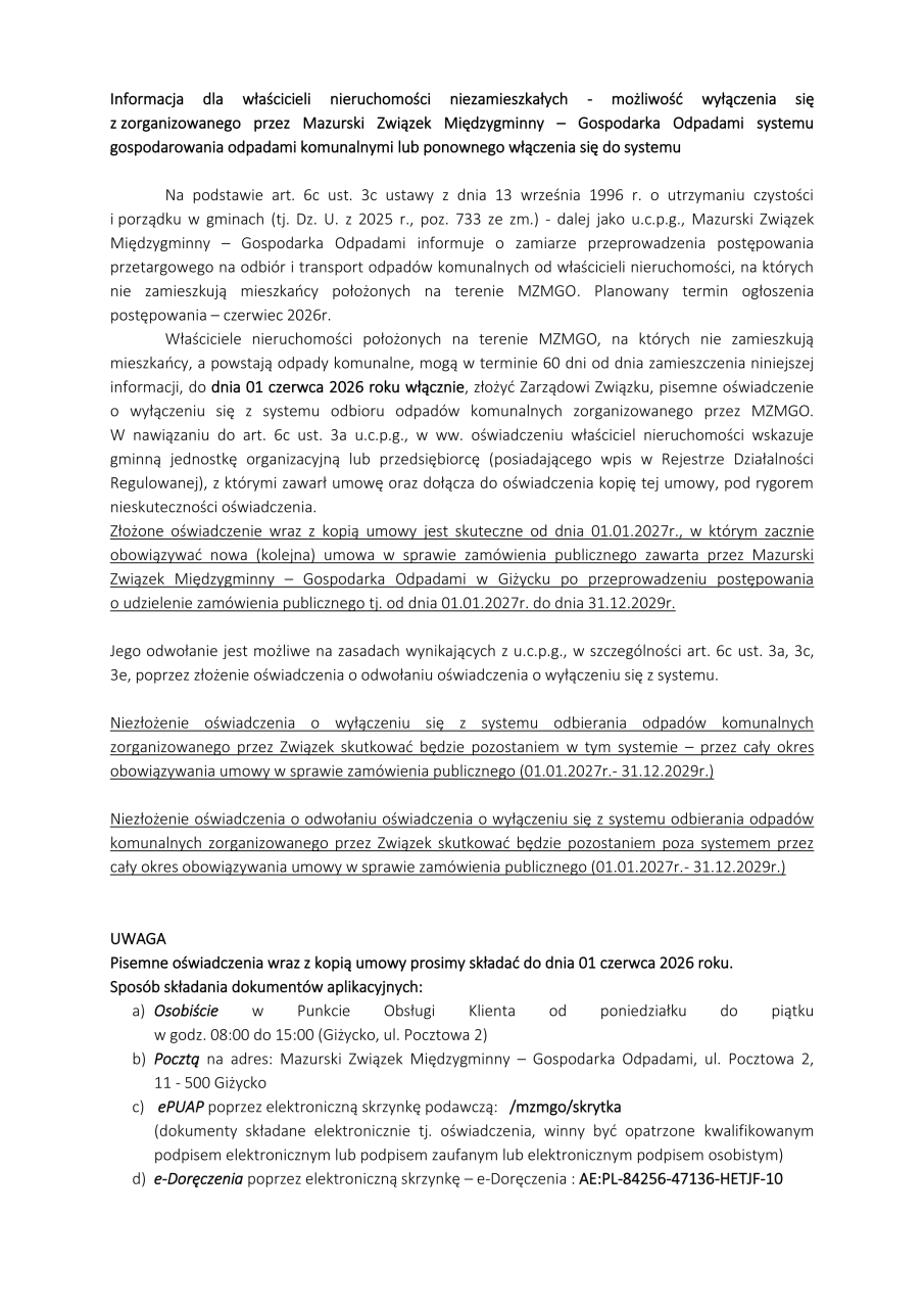 Emilia Kowalewska 1 kwietnia, 2026 Informacja o możliwości wyłączenia się z systemu gospodarowania odpadami MZM-GO Załączniki: wzór oświadczenia o odwołaniu oświadczenia o wyłaczeniu sie z systemu .pdf wzór oświadczenia o wyłączeniu się z systemu .pdf