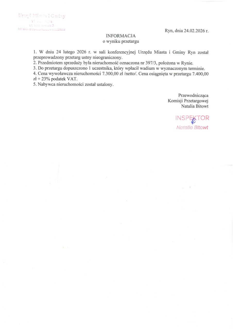 Informacja o wyniku przetargu.