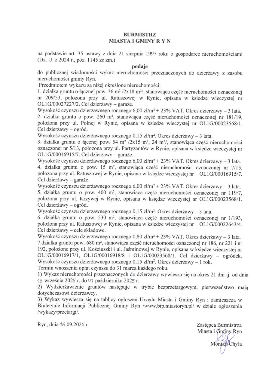 Natalia Bitowt 16 września, 2025 Wykaz nieruchomości przeznaczonych do dzierżawy z zasobu nieruchomości gminy Ryn.