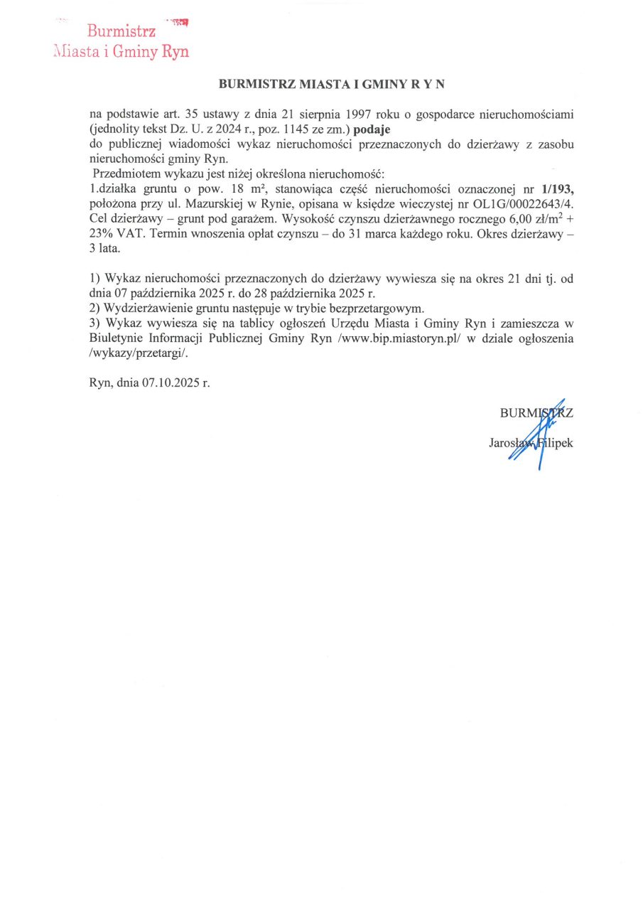 Natalia Bitowt 7 października, 2025 Wykaz nieruchomości przeznaczonych do dzierżawy z zasobu nieruchomości gminy Ryn.