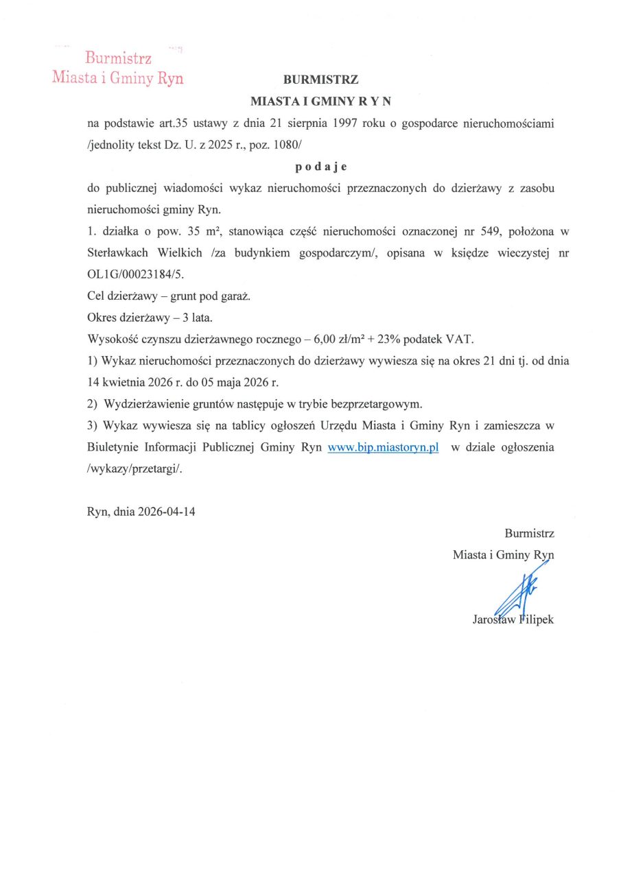 Natalia Bitowt 14 kwietnia, 2026 Wykaz nieruchomości przeznaczonych do dzierżawy z zasobu nieruchomości gminy Ryn.