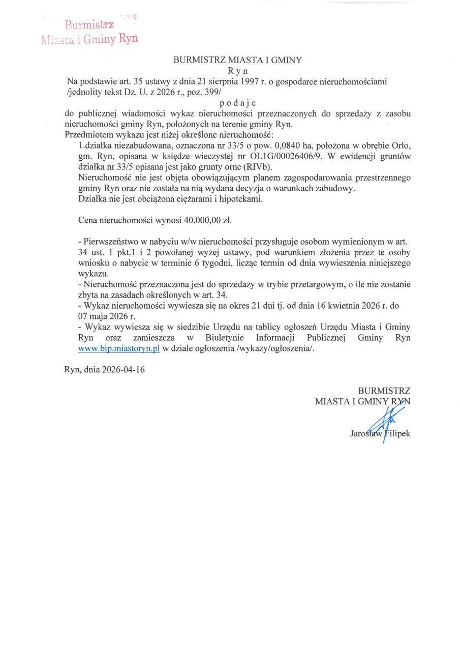 Wykaz nieruchomości przeznaczonych do sprzedaży z zasobu nieruchomości gminy Ryn, położonych na terenie gminy Ryn.