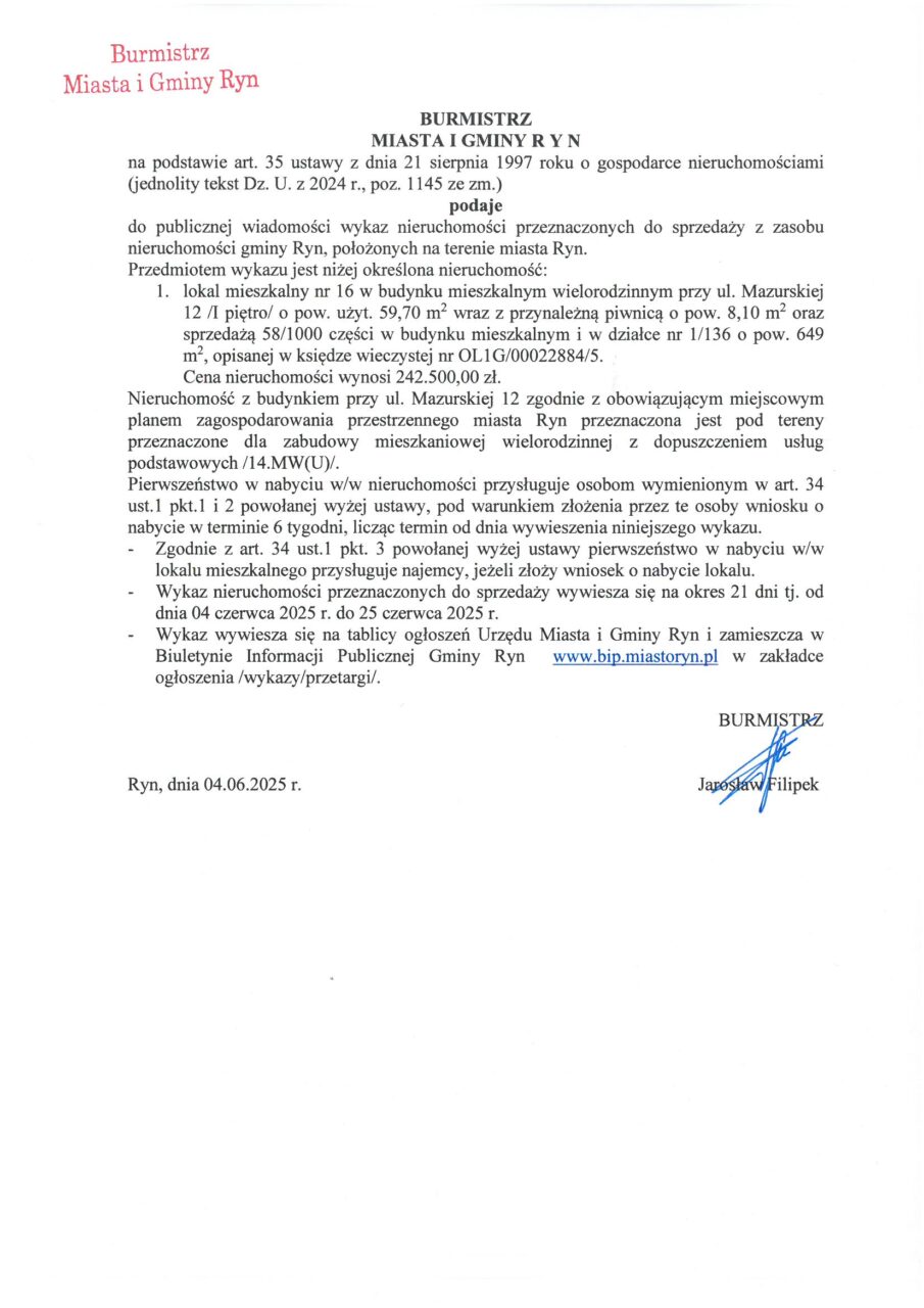 Natalia Bitowt 4 czerwca, 2025 Wykaz nieruchomości przeznaczonych do sprzedaży z zasobu nieruchomości gminy Ryn, położonych na terenie miasta Ryn.