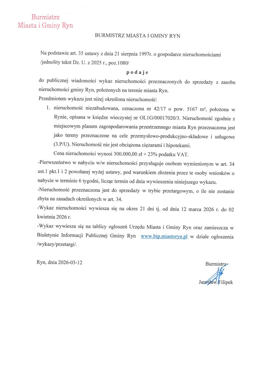 Natalia Bitowt 12 marca, 2026 Wykaz nieruchomości przeznaczonych do sprzedaży z zasobu nieruchomości gminy Ryn, położonych na terenie miasta Ryn.