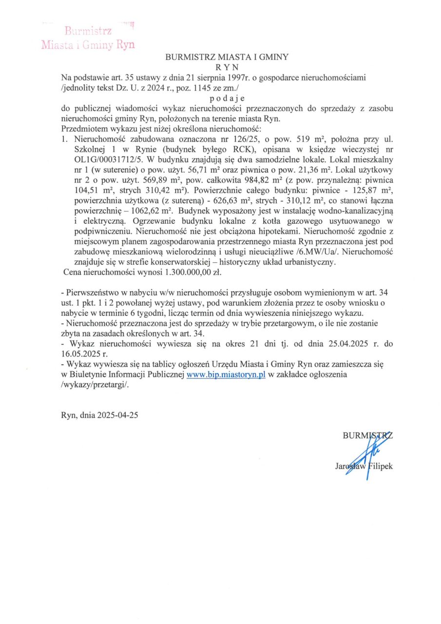 Natalia Bitowt 25 kwietnia, 2025 Wykaz nieruchomości przeznaczonych do sprzedaży z zasobu nieruchomości gminy Ryn, położonych na terenie miasta Ryn.