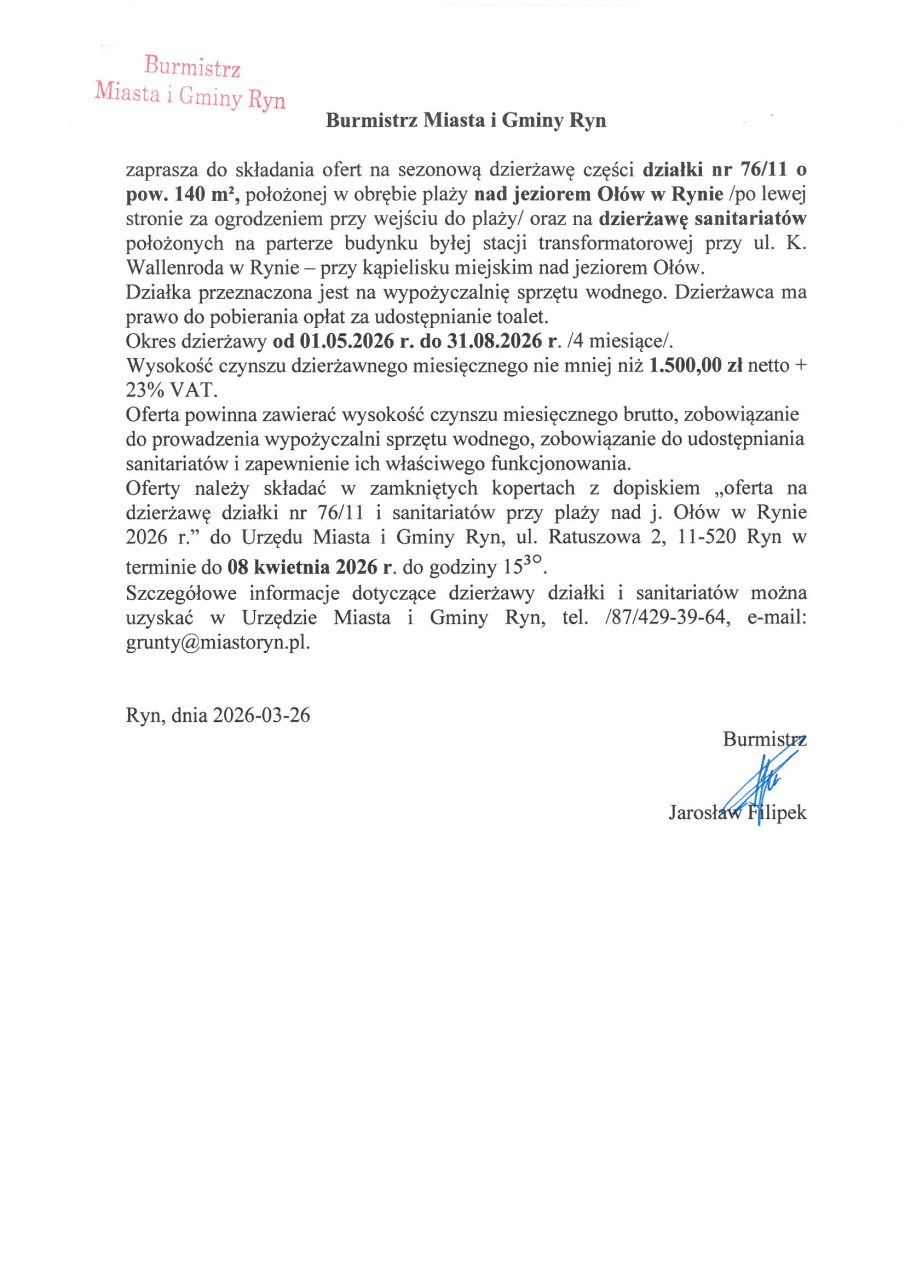 Natalia Bitowt 26 marca, 2026 Zaproszenie do składania ofert na sezonową dzierżawę. Załączniki: Mapa 76_11 .jpg